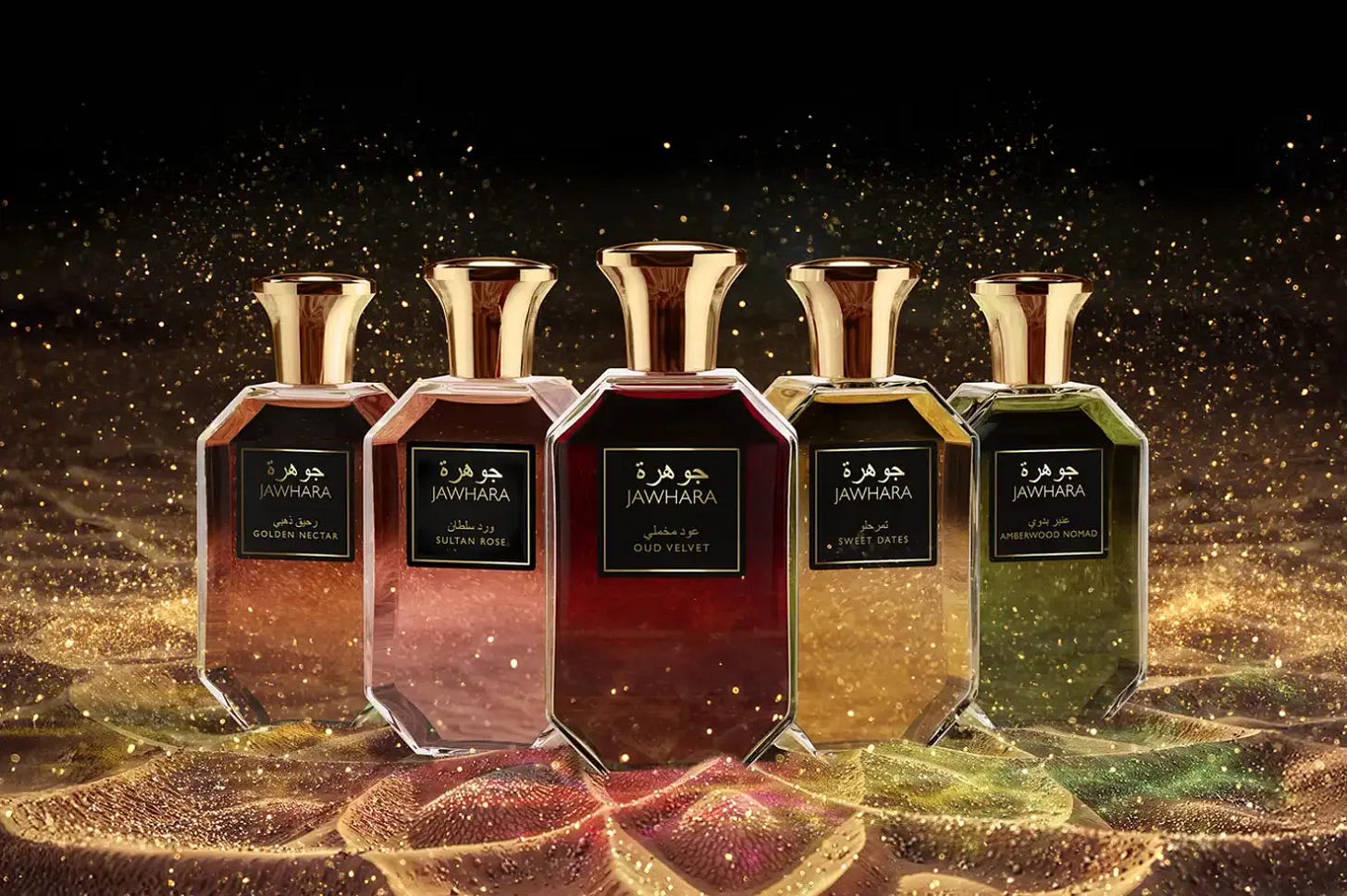 The collection features uniquely tinted bottles and bilingual labelling in English and Arabic. It includes Oud Velvet, a woody ambery scent with coriander, saffron and vanilla; Sultan Rose, a woody floral rose accord with saffron and peony; Golden Nectar, an ambery white blend with ylang-ylang, bergamot and musk; Sweet Dates, a fruity ambery fragrance with vanilla and date and Amberwood Nomad, an ambery fougère with cardamom, myrrh and cedarwood.